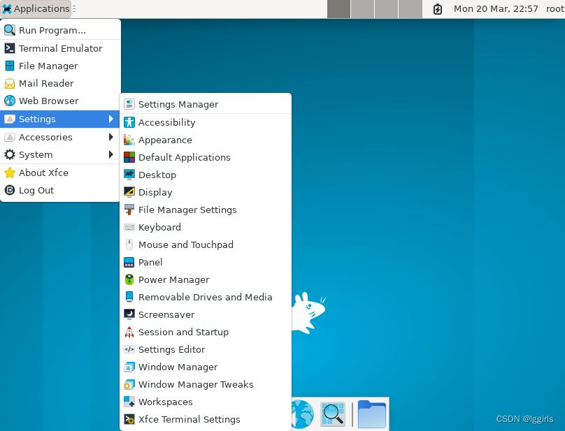 - apk add xfce4 xfce4-terminal xfce4-screensaver lightdm-gtk-greeter dbus